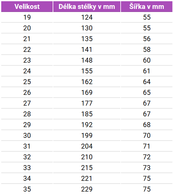 Tabuľka veľkostí Meryl Koral Barefoot sandále