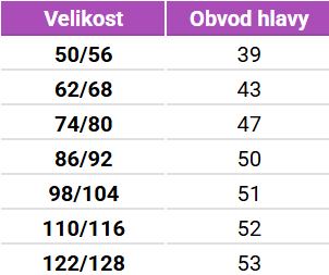 Tabuľka veľkostí MINYMO Klobúky a čiapky