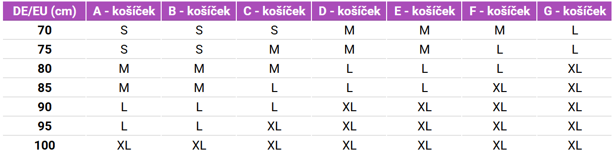 Tabuľka veľkostí MILKER dojčiace podprsenky