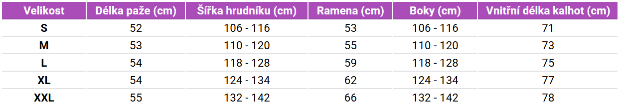 Tabuľka veľkostí SAFA PEGASUS Pánsky set